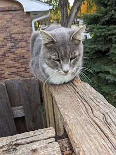I, The Prisoner, am thankful for a couple of dog-free days, and the chance to cuddle and purr with my Aunt Dottie, too.  I guess I hope that Ember is having fun at the Doggie Hotel she's staying at.